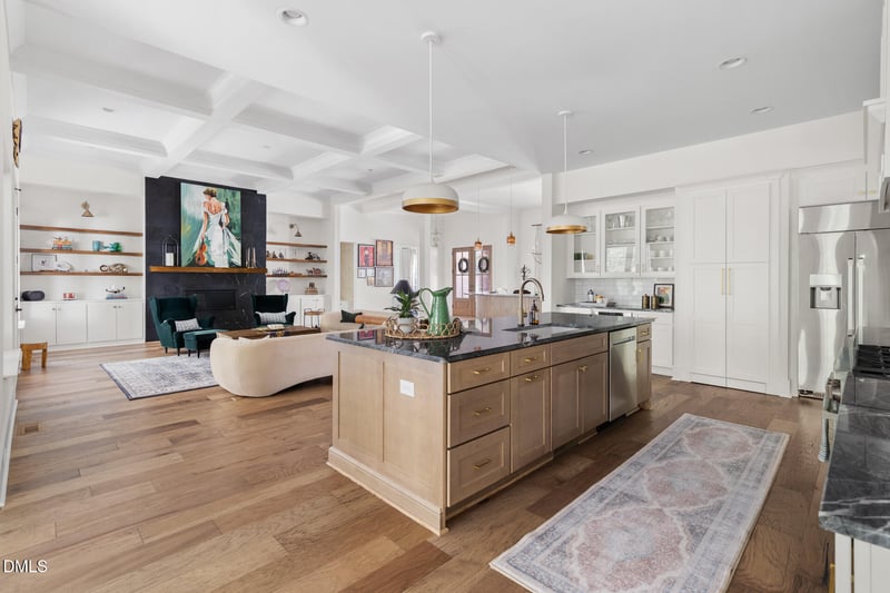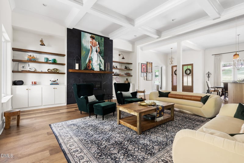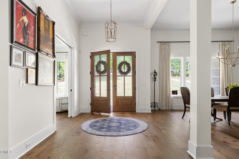 Listing details for 425 Ocoee Falls Dr, Chapel Hill, NC 27517 : Turn-key, better than new, custom-built home nestled on 6.5 beautifully landscaped acres in Chapel Hill's Windfall Neighborhood. Built in 2022 with meticulous attention to detail, enjoy a gracious floor plan that features a main floor primary suite, main floor guest bedroom with en-suite, and main floor office...a winning and rare combo. The open-concept layout showcases an impressive family room with 12-foot coffered ceilings, built-in bookcases, and a linear gas fireplace, perfect for gatherings. The gourmet kitchen equipped with high-end Dacor appliances features a large center island offering counter seating, ample cabinetry with walk-in pantry for ease and convenience, and marble backsplash. Adjacent is a bright breakfast area, surrounded by windows offering serene views of the private backyard. Showstopping screened porch with built-in Coyote grill and hood vent, Phantom screens, and Eze-breeze for true year-round enjoyment. Formal dining space and adjacent dry bar beckons entertaining. Cozy up in an additional gathering space on the main level featuring a vaulted ceiling and expansive windows providing canopy views of the lush landscape. The main floor primary suite is a true retreat with tall ceilings and bountiful light. Enjoy a luxurious ensuite bath with double vanities, soaking tub, walk-in shower, and deluxe walk-in closet with custom built-ins. Two additional bedrooms with private bathrooms on the second level. Epoxy garage equipped with EV charger, providing plenty of space for vehicles & more. A mudroom with custom built-ins, a laundry room of your dreams with it's ample size and storage. Sealed crawl space offers peace of mind. Easy to access walk-in attic storage. Zoned for Seaforth High School. Located less than two miles from Jordan Lake's scenic trails and water sport activities, featuring 150 miles of magnificent shoreline. Come see for yourself, embrace the lifestyle you've dreamed of - you won't want to leave!