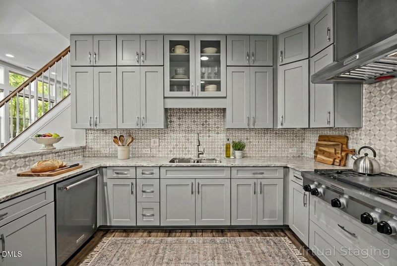 Listing details for 440 Monarda Way, Hillsborough, NC 27278 : Step into a light-filled two-story end unit within the Waterstone community: 3 BR, 2.5 BTH. The main level features a generous open layout, a first floor primary bedroom, zero carpet throughout and stunning oversized windows with custom treatments. Upstairs you'll find two additional bedrooms, a loft space and ample storage — ideal for a workspace or guest retreat. The chef's kitchen features beautiful cabinetry, gas cooktop, wall oven/microwave combo, and upgrades throughout offer quality and distinction. Outdoors, the setting feels private with a wooded backyard view. This home offers modern construction, energy efficient zoned heating & cooling, and the ease of a low-maintenance townhouse lifestyle. (Some pictures are virtually staged to show potential)