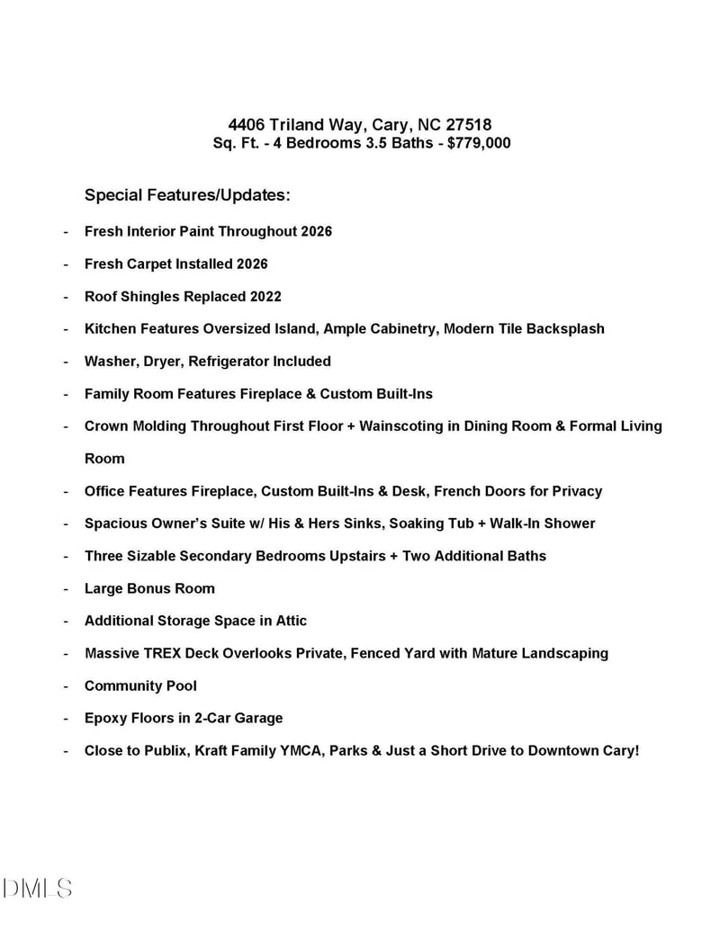 Listing details for 4406 Triland Way, Cary, NC 27518 : Beautiful brick-front home with mature landscaping in the highly sought-after Cotswold community - complete with a neighborhood pool! Ideally located near great schools, parks, the Kraft Family YMCA, Publix, and just minutes from vibrant Downtown Cary, this home offers both convenience and charm. Step inside to a thoughtfully designed floor plan perfect for today's lifestyle. Elegant architectural details including arched entryways, crown molding, and wainscoting enhance the formal living and dining spaces. The spacious kitchen is a true centerpiece, featuring an oversized island, abundant cabinetry, stainless steel appliances, and a stylish tile backsplash. The light-filled family room is warm and inviting, anchored by a cozy double-sided fireplace and custom built-ins. A private office or den with French doors, built-in desk, and shelving provides the ideal work-from-home setup, and the double-sided fireplace completes this room. Upstairs, the expansive primary suite offers a relaxing retreat with a tray ceiling, ceiling fan, and a spa-like bath complete with a soaking tub, dual vanities, walk-in shower, and generous closet space. Three additional bedrooms provide plenty of room for family or guests, including a convenient Jack-and-Jill bath with dual sinks. A large bonus room adds flexible space for a media room, playroom, or home gym and also includes a walk in attic space. Enjoy outdoor living on the impressive TREX deck overlooking a private, fenced backyard - perfect for entertaining or unwinding. Recent updates include fresh interior paint, new carpet throughout and Rust-Oleum RockSolid Polycuramine floor in garage. Don't miss this exceptional home - schedule your private tour today!