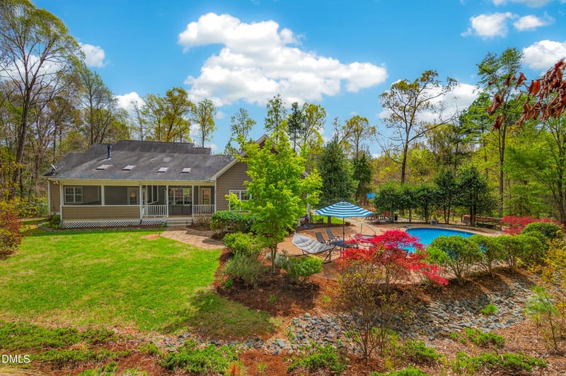 Listing details for 450 Ryan Rd, Pittsboro, NC 27312 : Discover your own totally private oasis right next to Jordan Lake in this beautifully maintained 1.5-story home, where comfort and elegance blend seamlessly. Freshly updated with new paint and designed for effortless living, this exceptional custom-built residence features a gourmet chef's kitchen with a center island, rich hardwood floors, and a stunning stone fireplace that anchors the warm, inviting living space. Enjoy year-round relaxation on the expansive screened porch, the front porch with swing, or meals on the back dining porch. The spacious primary suite offers direct access to the deck and pool area, creating a serene retreat just steps from your everyday living. With three bedrooms and a flex room/bedroom 4, a huge unfinished attic, and permits in place for two additional bedrooms, the home offers incredible flexibility--including potential for an ADU or multigenerational living. Immaculate condition throughout, with Spectrum fiber, Starlink, and a dual-fuel generator already in place. Step outside and experience a true outdoor sanctuary on park-like three and a half acres, with a fenced vegetable garden and mature perennial landscaping with an irrigation system in place. Entertain with ease in the resort-style backyard featuring a saltwater inground pool, 6-person hot tub, flagstone patio with fire pit, and a tranquil Koi pond with blooming lotuses. Nature lovers will appreciate private walking trails leading to Jordan Lake--just a 10-minute walk via private easement--where you can enjoy boating, wildlife sightings, and even a nearby bald eagle's nest. Two boat/kayak ramps are only 5 minutes away. Located just minutes from downtown Pittsboro and half an hour from Chapel Hill and RDU, this one-of-a-kind property offers the perfect blend of peaceful HOA-free rural living with convenient access to dining, shopping, and amenities.