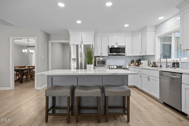 Listing details for 4500 Embleton Dr, Raleigh, NC 27612 : Charming ranch-style home with a 2-car garage in sought after Midtown Raleigh location! This light-filled home showcases an open, airy floor plan anchored by a custom-designed kitchen featuring crisp shaker cabinetry, quartz countertops, a sleek glass tile backsplash, and stainless steel appliances. Soaring ceilings elevate the space, while wide engineered plank flooring flows throughout the main living areas and plush carpet adds comfort to the bedrooms. Retreat to a beautiful primary suite with dual closets. Enjoy the convenience of an oversized mudroom loaded with cabinetry. Relax on the screened porch overlooking a private backyard. New Roof and Patio. Windows installed in 2023.