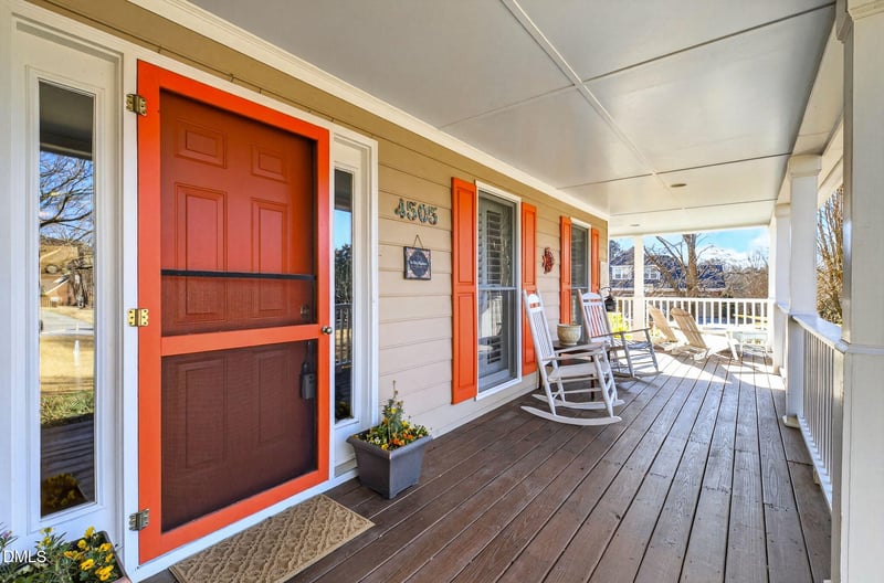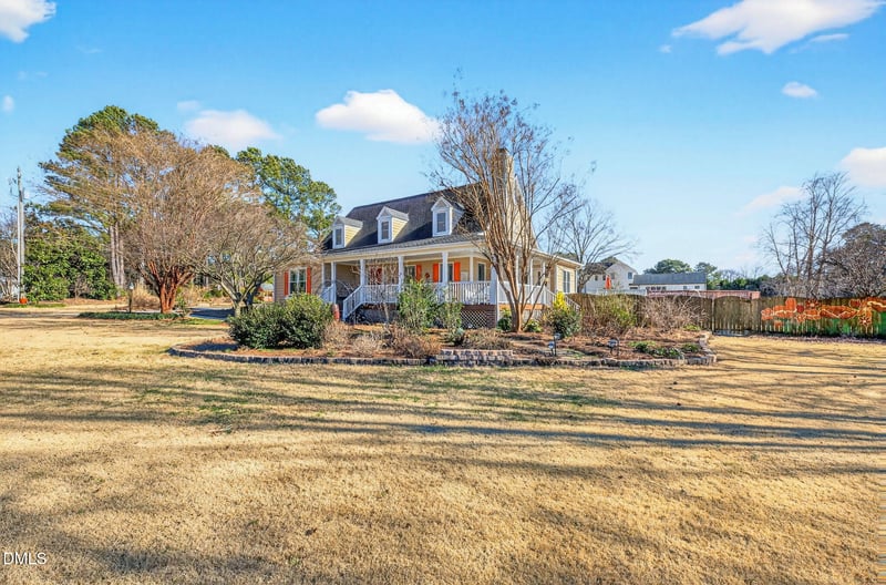 Listing details for 4505 Goosehaven Ln, Holly Springs, NC 27540 : This stunning 1.5-story home sits on a private .97-acre lot and features a charming wraparound front porch—perfect for enjoying peaceful sunsets. Hardwood floors flow throughout the main level, where you'll find an open family room with a cozy fireplace, a formal dining room with direct porch access, and a bright kitchen with white cabinetry, stainless steel appliances, electric range, pantry, and eat-in space.
