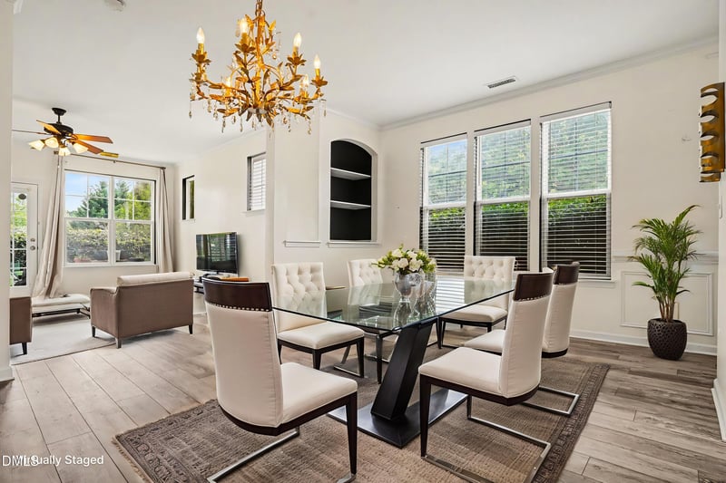 Listing details for 4602 Peyton Hall Way, Raleigh, NC 27604 : Former model home + end unit = loaded with upgrades and style! This charming Raleigh townhome offers 1,500+ sq ft of open living space with beautiful LVP floors, a designer kitchen with laminate countertops, gas range, and a large island perfect for gathering. Custom built-ins elevate the dining space, all flowing effortlessly into the bright living area with patio access. Upstairs, both bedrooms have private baths, while the spacious primary suite features a dreamy sitting area--perfect for a home office, lounge, or nursery--plus a spa-like bath with soaking tub and separate shower. Custom wallpaper throughout adds the perfect designer touch!