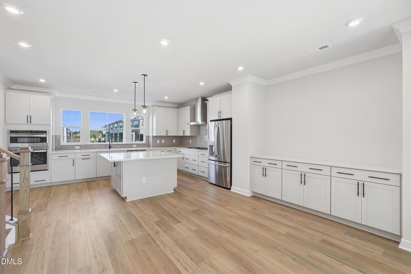 Second Floor Living: Ascend to the second floor, where you'll find the heart of the home. The expansive great room flows seamlessly into the dining area and gourmet kitchen, making it perfect for gatherings. The kitchen is a chef's dream and French door GE refrigerator featuring upgraded white cabinets with convenient sliding drawers, a vented hood that exhausts to the exterior, and a five-burner natural gas cooktop. Right off the kitchen enjoy a home office for those who work from home.