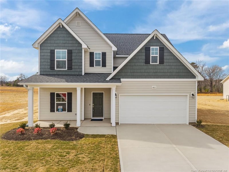 Listing details for 465 Black Duck Ln Lot 103, Lillington, NC 27546 : This incentive won't last long - $10,000 to Use-As-You-Choose using the preferred lender-must close by April 30, 2026! The Graham is situated on a generous 0.58-acre lot, this beautifully designed home offers a functional and open layout ideal for modern living. Off the foyer, you'll find a dining room and a convenient half-bath.The kitchen, breakfast area, and great room flow seamlessly together, opening to a grill patio—perfect for indoor-outdoor entertaining. The kitchen features a large eat-in island, white shaker cabinets, granite countertops, deep pantry, and stainless-steel appliances including a smooth-top range, microwave, and dishwasher. Home office with a closet is located on the main floor.Upstairs, a spacious loft adds versatile living space and sits near a laundry room and linen closet for added convenience.The primary suite serves as a private retreat, complete with a spa-like en-suite bathroom showcasing a white dual sink vanity, relaxing garden tub, walk-in shower, private water closet, and a large walk-in closet with natural light.Two additional bedrooms—each with walk-in closets—share a full hall bathroom with a vanity, tub/shower combo, and linen storage. Exterior features include a welcoming front porch, low-maintenance vinyl siding with shake accents, dimensional roof shingles, and a smart keypad entry.Additional highlights: 2-car garage, fiber optic internet availability, Energy Plus certification, and a 1-2-10 builder in-house warranty. Duck's Landing is a charming community in the peaceful countryside of Lillington, NC, featuring planned amenities like a tot lot, dog park, and picnic area, all with convenient access to Lillington, Fort Bragg(20 min), Raleigh, and Fayetteville.