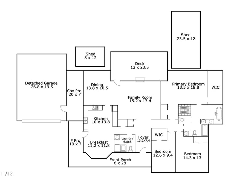 Listing details for 4700 Carolton Dr, Raleigh, NC 27606 : The Private Modern Ranch: True Single-Story Living with NO City Taxes & NO HOA on a huge lot! Escape to this beautifully renovated, turn-key home nestled on a private, nearly one-acre cul-de-sac lot in the peaceful Carolton neighborhood. This is a rare opportunity for true single-story living, combining modern updates with the coveted privacy and space of a neighborhood with large lots. Enjoy low-cost ownership with County-only taxes and the freedom of no HOA dues! The spacious 1,989 sq ft home has undergone a thoughtful and stunning renovation, offering a seamless, open layout. The centerpiece is the huge, eat-in kitchen, featuring expansive Quartz countertops, brand new custom cabinets, and sleek stainless-steel appliances--a perfect gathering spot for family and friends. The luxurious owner's suite provides a tranquil retreat with a spa-like bath, featuring a separate walk-in shower, water closet, and large walk-in closet. Brand new flooring, fresh paint, and smooth ceilings complete the modern interior aesthetic. Outdoor living is paramount here. The home boasts a charming wrap-around front porch and an expansive rear deck, offering multiple options for dining and relaxing outdoors. For the hobbyist, entrepreneur, or fitness enthusiast, the massive lot includes a detached, heated workshop/flex space--ideal for a private home office, gym, or art studio. Located just three minutes from the scenic beauty of Yates Mill Pond County Park, you get the perfect blend of country living and close proximity to Raleigh, Cary and Holly Springs amenities.
