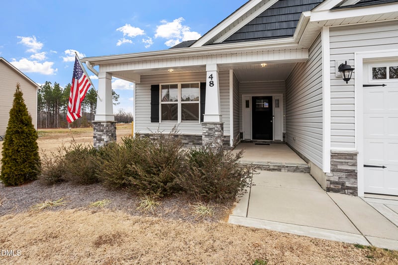 Listing details for 48 Laramie Ln, Selma, NC 27576 : Welcome to 48 Laramie Lane, a delightful 3-bedroom ranch home with a 3-car garage, built in 2023 and situated on a large, flat, newly fenced 0.70-acre lot. The open-concept floor plan features a kitchen with large island, granite counters, and stainless appliances, which is open to the living room with gas fireplace, vaulted ceilings, and built-ins. The light-filled dining area features custom wainscoting. Enjoy the large primary bedroom with tray ceiling and crown molding, spa-like bath + 2 walk-in closets! Two ample sized secondary bedrooms share a hall bath. A mud room and separate laundry room complete this one-story gem. Outside features a covered front porch and a covered back patio (that could be screened) overlooking the large, private back yard. Easy access to shopping and major highways!