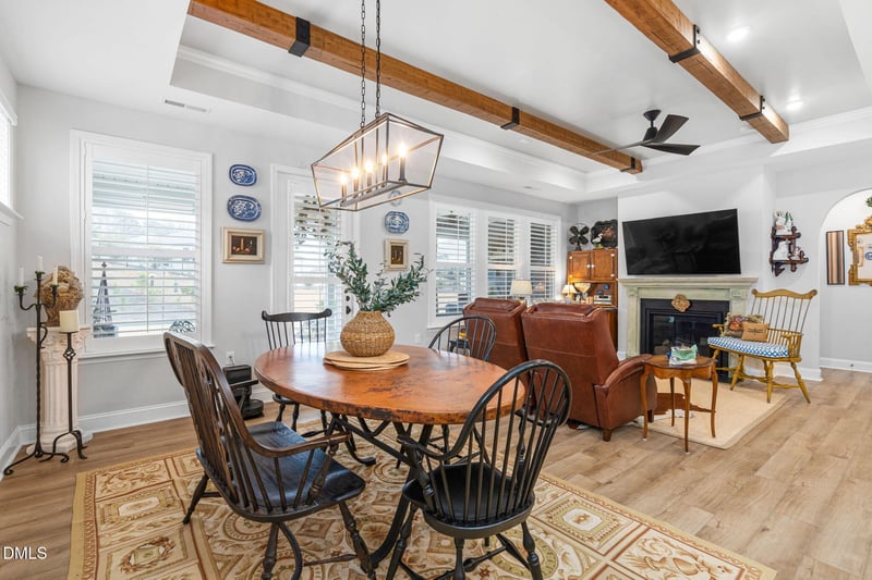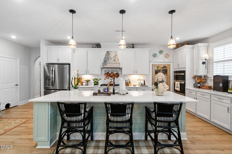 The heart of the home is the chef's kitchen, perfect for gathering and entertaining, with an expansive island, generous walk-in-pantry, with French Antique pantry door and custom hydrangea wallpaper, and seamless flow into the living area. The added beams in the living room bring character and warmth, creating a space that feels both inviting and sophisticated.