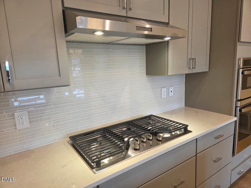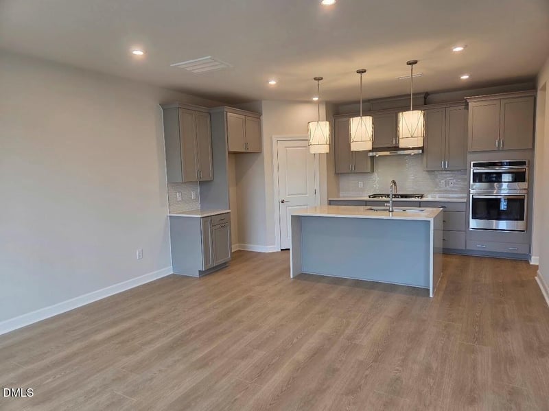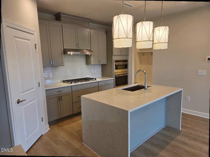 This Sampson Plan townhome features an open, light-filled layout with thoughtfully curated finishes already included, allowing buyers to avoid additional upgrade costs and enjoy a fully finished home from day one. The gourmet kitchen anchors the main level with Stone Gray cabinetry, Carrara Veil quartz countertops, and a striking waterfall island that blends durability with modern style. A clean white linear mosaic backsplash, premium stainless steel appliance suite, gas cooktop, combination wall oven, and sleek under-cabinet hood create a space that's both beautiful and functional. Satin nickel pendant lighting and a touch-activated chrome faucet add polished, everyday convenience.
