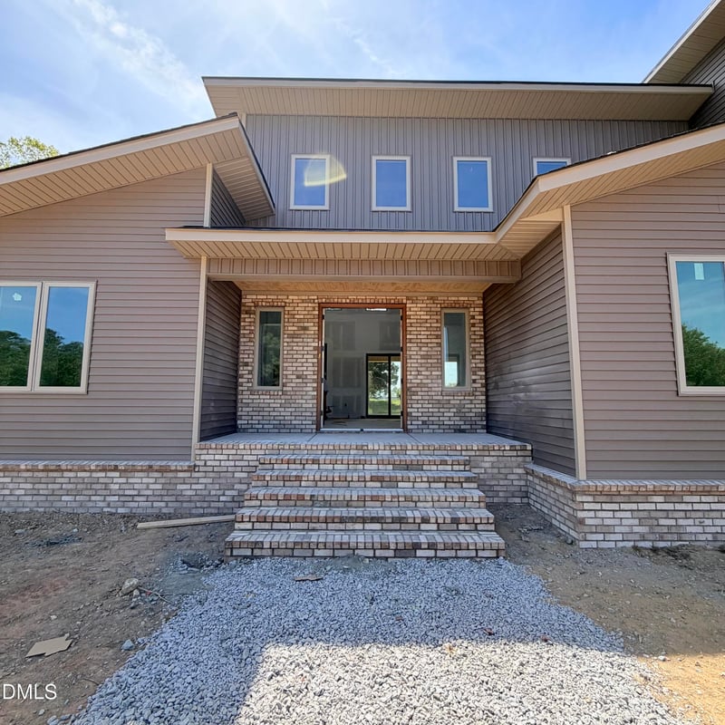 Listing details for 50 Wiggins Rd, Louisburg, NC 27549 : This modern contemporary new construction sits on nearly two acres with no HOA, offering bold architectural design with brick accent detailing, cable railing on the covered front porch, and a side-load two-car garage with a rear access door, perfect for lawn equipment, a workshop, or a home gym. Soaring ceilings and oversized high windows fill the open concept living space with natural light, showcasing the elaborate custom fireplace. Double French doors in the front, and large sliding glass doors open to the back patio, creating a seamless indoor-outdoor flow. The kitchen features a large center island, rich dark cabinetry, and a custom walk-in pantry, with an adjacent dining room highlighted by a stunning accent wall. The main floor primary suite includes a spacious custom walk-in closet and a spa-inspired en suite with dual-sink vanity, tile shower with dual heads, and a separate water closet. A second bedroom on the main floor, large laundry room, and custom drop zone cubby add everyday functionality. Upstairs offers a large open loft, third bedroom, and an additional office or storage room. Built with Zip System construction, a sealed conditioned crawl space, and a generator plug already in place. Opportunities to own nearly two acres, a home of this size, and this level of craftsmanship -- with no HOA -- are rare at this price point.
