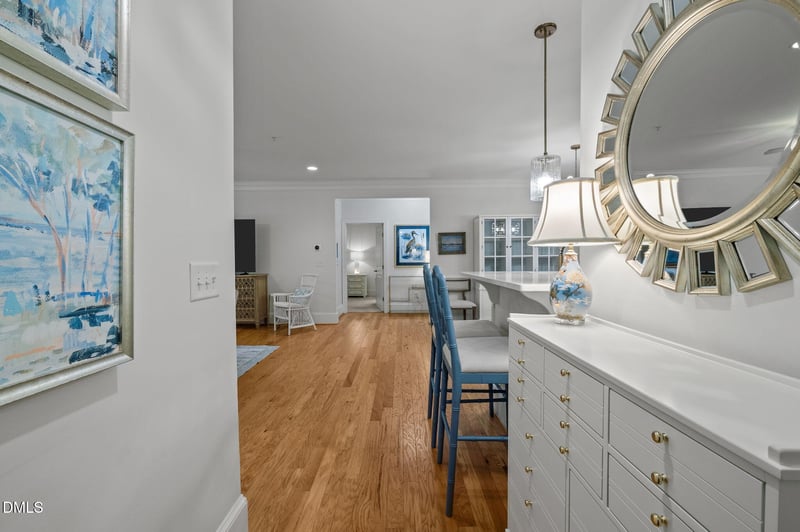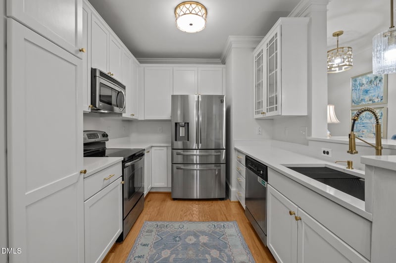 Listing details for 501 Finsbury St #202, Durham, NC 27713 : Beautifully updated 2BR, 2.5BA single-level condo in the heart of the Research Triangle--just minutes to Duke, UNC, RTP, RDU, I-40, I-540, dining, shopping, and scenic biking trails. Located less than two miles from Boxyard RTP and the new Hub RTP, this home offers exceptional convenience in a thriving area. This bright second-floor unit features an open-concept layout with a spacious family room, generous dining area, and a private covered balcony. The kitchen boasts new quartz countertops, a Kraus Core workstation stainless steel sink with accessories, freshly painted cabinets with updated hardware, bar seating, and stainless steel appliances--including an upgraded refrigerator. Hardwood flooring, upgraded light fixtures throughout, and a Nest thermostat add modern comfort and style. The primary suite offers a large all-tile walk-in shower, while the second bedroom has access to its own adjacent bath. Bathroom vanities have been refreshed with paint and new hardware, and a large-capacity upgraded washer makes laundry a breeze. Move-in ready with thoughtful updates and a prime location--low-maintenance living close to everything the Triangle has to offer.