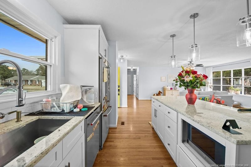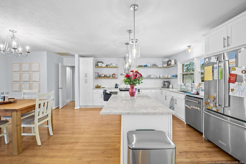 Listing details for 501 Lennox Dr, Fayetteville, NC 28303 : You will be amazed upon entering this beautifully updated home featuring hardwood floors throughout the open great room, dining area, and kitchen, creating an ideal layout for everyday living and entertaining. The kitchen offers a large island with built-in microwave, granite countertops, white shaker cabinets, stainless steel appliances, smooth-top range with updated exhaust hood, and open shelving, allowing you to stay connected with guests while preparing meals. The dining area flows seamlessly into a sunroom that is perfect for relaxing, enjoying outdoor views, or use as a playroom. The living room boasts a beautiful bay window. The spacious primary bedroom includes hardwood floors, a walk-in closet, and a newly updated bath with a stunning tiled shower and marble double-vanity countertops. Three additional bedrooms with hardwood floors and two updated baths provide ample space. Major updates include a new architectural shingle roof (2023), HVAC system (2023), paid-off solar panels installed in 2023, new refrigerator (2024), and a new fence (2023). This move-in-ready home offers comfort, style, and peace of mind and is ready for a new family to call it home.
