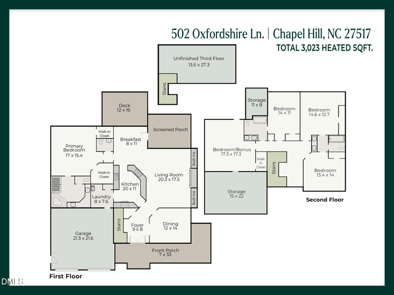 Listing details for 502 Oxfordshire Ln, Chapel Hill, NC 27517 : This one makes a strong first impression and backs it up. Located in Southpoint Manor with standout curb appeal. Wrap-around brick front porch and screened porch overlooking the fenced backyard with deck. Fresh interior paint, new lighting, and hardwoods on the main level. First-floor primary suite with nearby laundry. Three spacious secondary bedrooms, plus a bonus room that lives like a true second living space or home office, not an afterthought. Unfinished third floor pre-plumbed for a bath, along with two walk-in attics on the second floor, a slightly indulgent amount of storage and future space that feels a little extra in the best possible way. New roof and appliances, oversized garage, irrigation system. Steps to the pool, clubhouse, and playground.