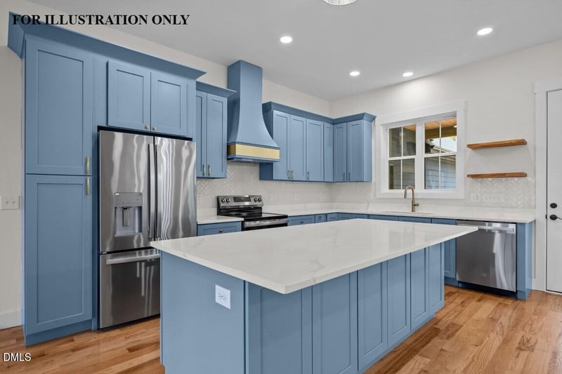 A gourmet kitchen, which timeless quartz countertop, custom painted cabinetry, a center island with barstool seatinng, stainless steel appliances and a spacious walk-in pantry for ample storage. The kitchen flows into a large dining area, serving as the gateway to a massive rear covered porch overlooking your private backyard oasis!