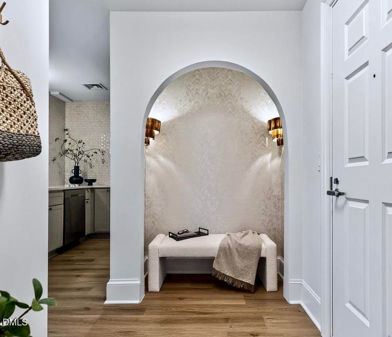 From the moment you enter, curated design details set the tone. From the arched niche with designer wallcovering, to the wide-plank luxury flooring, new solid-core doors, and modern light fixtures throughout. The main living space is both striking and functional, anchored by a floor-to-ceiling custom porcelain-tile fireplace surround, bespoke built-ins, and a stunning white-oak fluted feature wall.