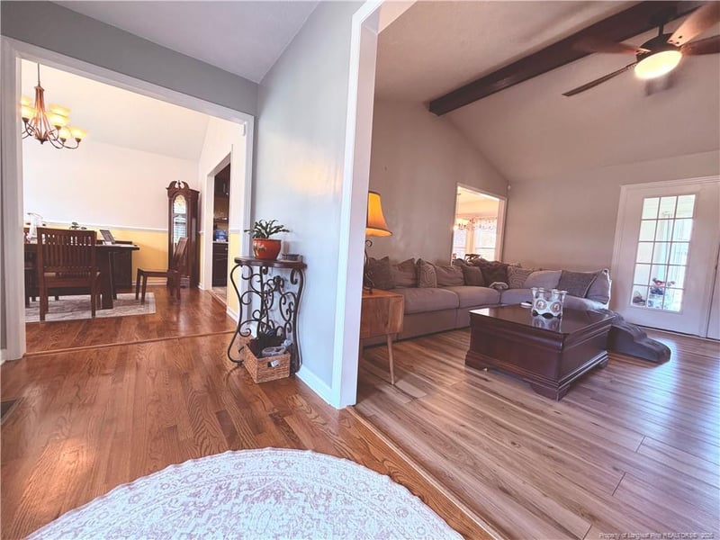 Listing details for 5120 Spruce St, Hope Mills, NC 28348 : Welcome to this beautifully ranch-style home on a spacious corner lot in a friendly, established Pinewood Lakes neighborhood. Home features 3 bedrooms with 2 full baths, living room with vaulted ceiling, fireplace and french door that leads to the sunroom, formal dining room with hardwood floors and vaulted ceiling, kitchen with granite and stainless-steel appliances and modern cabinetry, breakfast nook with bay-window, large master suite, walk-in closet, master bath has been updated with luxury vinyl flooring, granite counter top and tile shower, the two additional bedrooms are nicely sized. ,fully fenced backyard, establish garden pots This home offers comfort, style, and ample space both indoors and outdoor perfect for everyday living and entertaining. Just 20 minutes from Fort Bragg (14 miles), Walking distance to Elementary and High School, Hope Mills Lake and shopping areas *** Don’t miss your opportunity to make this beautiful home yours! ***