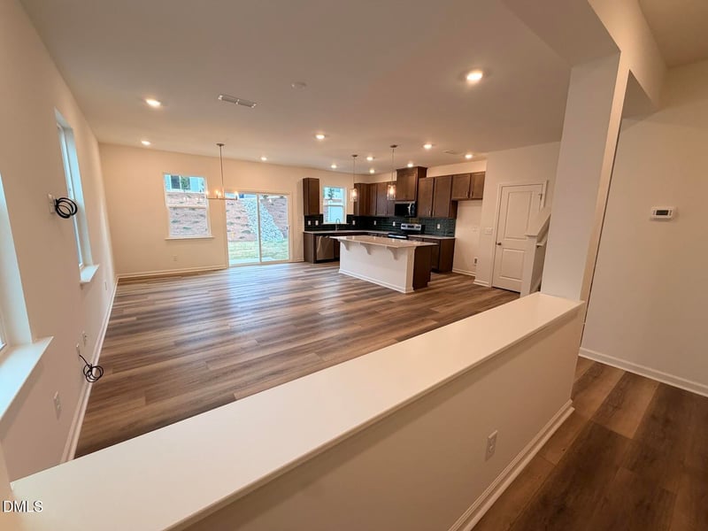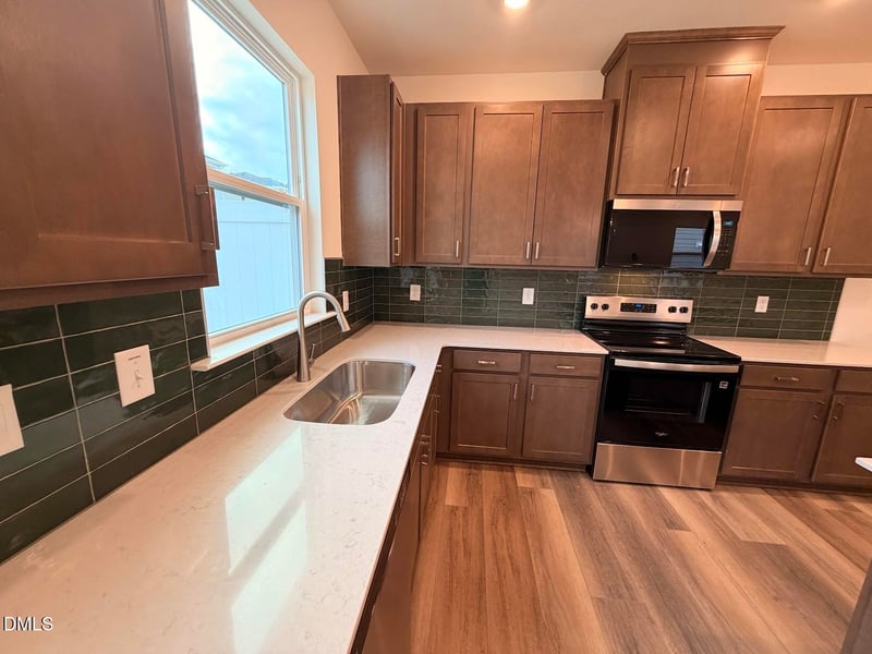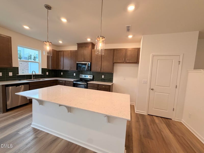 Listing details for 514 Sunset Lake St, Durham, NC 27704 : This spacious and light-filled end unit townhome features 3 bedrooms, 2.5 baths, and a 2-car garage. With a thoughtfully designed open floor plan and 9-foot ceilings, the home offers a bright and airy feel throughout. The gourmet kitchen is a standout, showcasing a large island with quartz countertops, luxury vinyl plank flooring, modern Whirlpool® stainless steel appliances, Aristokraft cabinetry, and Moen® fixtures.