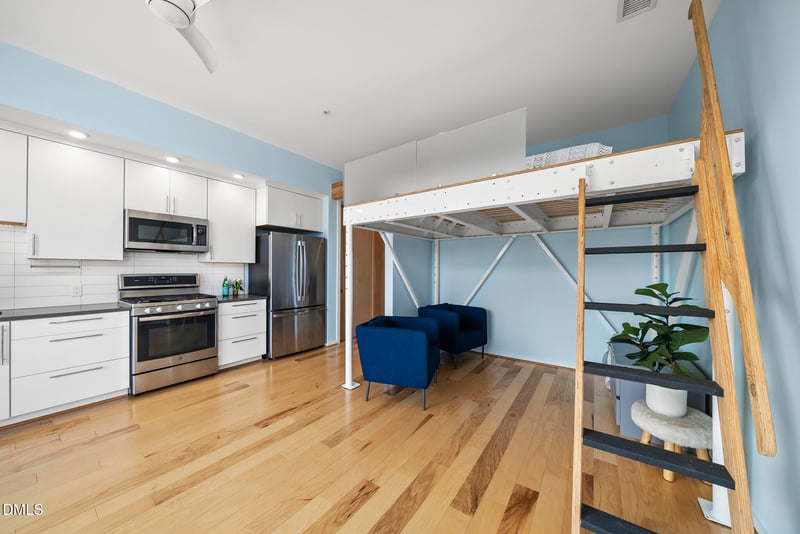 Listing details for 515 Mangum St #41, Durham, NC 27701 : Welcome to 515 N Mangum Street, Unit 41 - a stylish studio condo in the heart of downtown Durham that blends modern design with urban convenience. This light-filled condo features warm hardwood floors, oversized windows, and a bright open layout that feels both airy and functional. The contemporary kitchen offers sleek cabinetry, clean lines, and efficient storage, while the open living space easily accommodates dining and entertaining. A standout feature is the lofted platform space, creating a flexible area for lounging, sleeping, or a creative retreat. The modern industrial touches add personality and a true downtown-loft feel. Step outside to your private balcony- perfect for morning coffee or evening unwinding with city views. Located on the 4th floor, this unit sits on the same level as the community deck and patio, making it easy to host guests or enjoy outdoor space. The building includes elevator access, secure entry, and a lock-and-leave lifestyle ideal for busy professionals or investors. A designated parking space conveys with the unit, and ample street parking in front of the building makes hosting easy. Prime downtown location near American Tobacco Campus, Durham Performing Arts Center, Durham Central Park, Durham Bulls Ballpark, dining, coffee shops, and entertainment. Low HOA dues enhance affordability and investment appeal. We welcome you to enjoy the vibrant culture that defines downtown Durham!