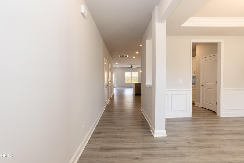 A covered front porch invites you into the foyer, where you're greeted by a formal dining room showcasing tray ceilings, crown molding, and elegant board-and-batten trim.