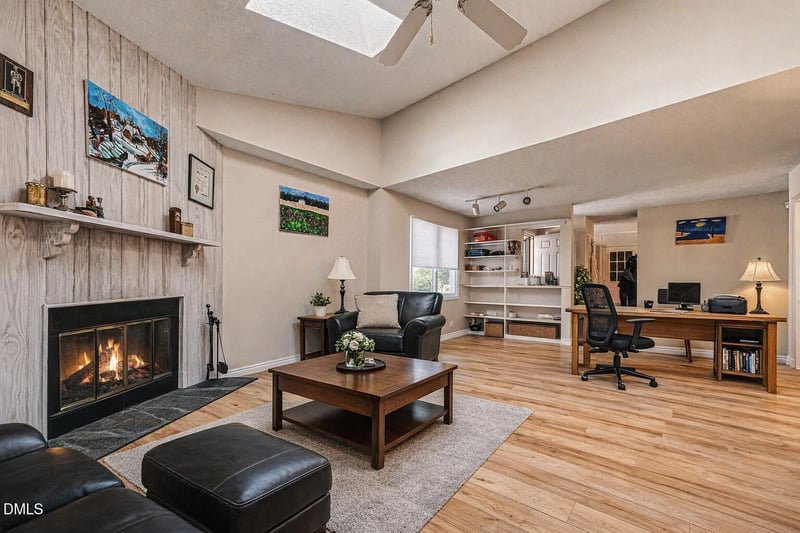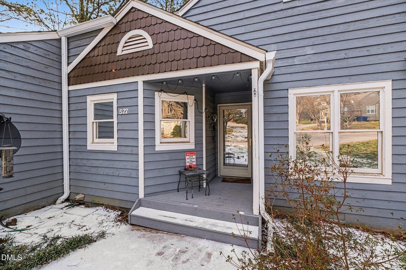 Listing details for 527 Woodwinds Dr, Durham, NC 27713 : Charming home with distinctive character and great potential, set on a wooded lot with a welcoming front porch and rear deck. Inside, you'll find hardwood floors, vaulted ceilings, skylight, and a floor-to-ceiling wood-burning fireplace that anchors the main living space. Built-in shelving and an open layout provide flexibility for everyday living, work-from-home, or creative use. The sealed crawl space adds great value. The kitchen offers ample cabinet space, natural light, and a functional layout ready for personalization. Spacious primary bedroom features hardwood floors, ceiling fan, and direct access to the bath. Outdoor living includes both a front porch and elevated rear deck, perfect for enjoying the natural surroundings. This home presents a fantastic opportunity for buyers looking to add value and make it their own in an established neighborhood.
