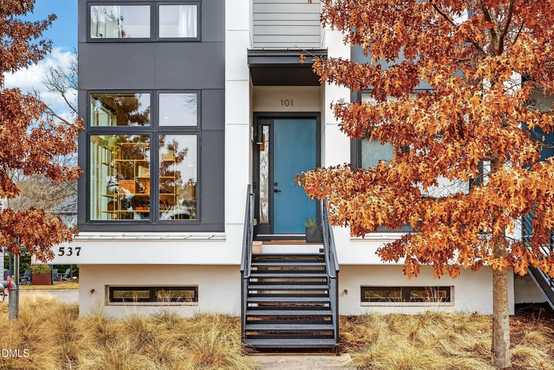 Listing details for 537 New Bern Ave #101, Raleigh, NC 27601 : Modern condo living just minutes from Downtown Raleigh, located along the edge of Historic Oakwood. This end unit at 537 New Bern #101 offers clear, unobstructed skyline views from a private rooftop terrace, a standout feature for enjoying evenings, entertaining, or taking in the city lights.