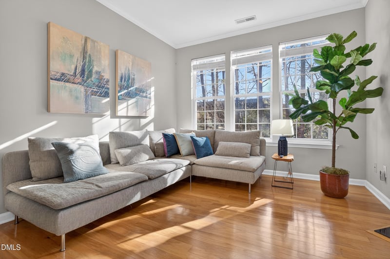 Listing details for 5435 Silver Moon Ln, Raleigh, NC 27606 : Instead of spending your Saturday morning mowing, would you rather a) sip your favorite weekend beverage on your covered porch or b) catch some rays and cool off with a dip in the pool? 5435 Silver Moon Ln says, ''Why choose?!'' This 4-bedroom, 3.5 bath end-unit townhome blends at-home comfort with neighborhood amenities and low-maintenance living. Designed for comfort from top to bottom, the ground floor features a versatile bonus room with its own full bath - ideal as a private gym, guest suite, home office, or cozy retreat. The main level is soaked in natural light, making the open-concept living, dining, and kitchen area feel bright, airy, and welcoming. Upstairs, three additional bedrooms include a spacious primary suite with a walk-in closet and roomy en-suite bath, offering a peaceful retreat at the end of the day. Enjoy outdoor living on the covered porch or the lower patio, both backing up to a wooded buffer for added privacy. And when you're ready to explore, you're less than 5 minutes from Lake Johnson Park and Cary Crossroads, plus 10 minutes from Downtown Raleigh - making everyday life simpler, more connected, and more enjoyable.