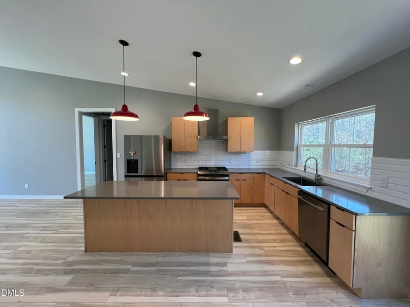 This 3BR/2BA custom home features soaring vaulted ceilings, 8-ft doors throughout, and walls of windows that bring the outdoors in. The open floor plan seamlessly connects the living room, dining area, and kitchen into one bright, expansive space with durable LVP flooring throughout the main living areas.