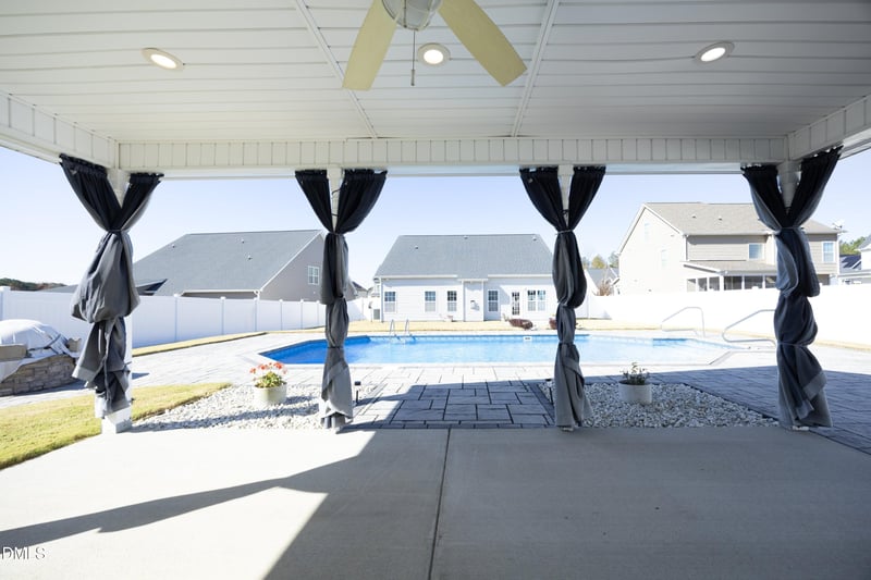 Step outside to your private backyard retreat, featuring a solid privacy fence, a sparkling in-ground pool, and a tile patio ideal for relaxing or hosting gatherings. The pool storage shed includes a large covered patio, cable ready, and electrical outlets—perfect for outdoor dining, movie nights, or game-day fun.