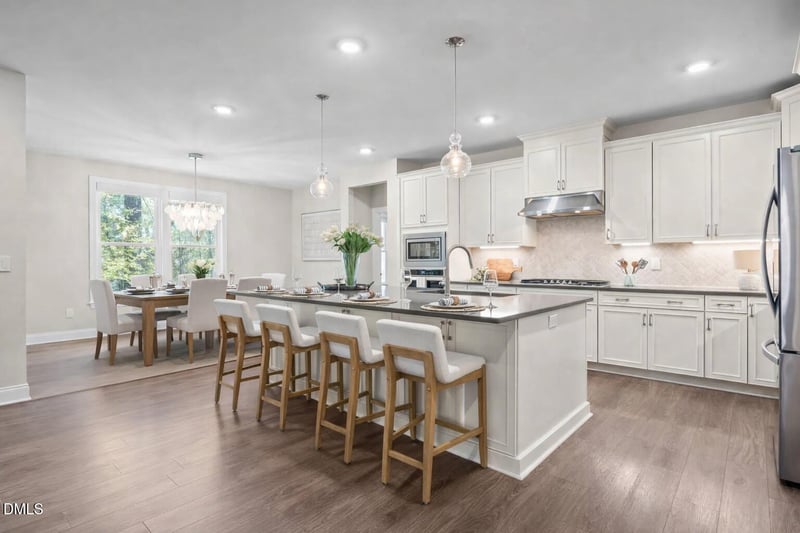Listing details for 551 Glenville Lake Dr, Fuquay Varina, NC 27526 : 551 Glenville Lake Drive in Fuquay Varina offers style, space, and thoughtful design in this 5 bedroom, 4 and a half bath home with a dedicated office, spacious loft, and three car tandem garage. A charming covered front porch leads into a bright interior featuring Luxury Plank Vinyl flooring and 10 foot ceilings on the main floor, creating an open and elevated feel ideal for everyday living and entertaining. The kitchen is the heart of the home with a large quartz island, abundant cabinetry, a five burner range, and a stylish herringbone backsplash, flowing seamlessly into the living room with a cozy fireplace, sunroom, and access to a grilling deck overlooking peaceful wooded views. Just off the kitchen, a custom mudroom drop zone with built ins adds everyday organization. The main floor also includes a private guest suite with a walk in closet and ensuite bath with a custom tiled shower, as well as a dedicated office or study. Upstairs, the expansive loft provides flexible living space, while the luxurious primary suite features dual vanities, a freestanding soaking tub, a large tiled shower with bench seating, and two oversized walk in closets with custom built in organizers. Three additional bedrooms, two full bathrooms, and a convenient laundry room complete the second floor. Enjoy wooded privacy with winter lake views and HOA approval already in place for a gravel path to the water. South Lakes amenities include two pools, a clubhouse, walking trails, playgrounds, multiple lakes, a boat ramp, and a fishing pier, all conveniently located with easy access to Downtown Raleigh and RTP via US 401 and I 540.