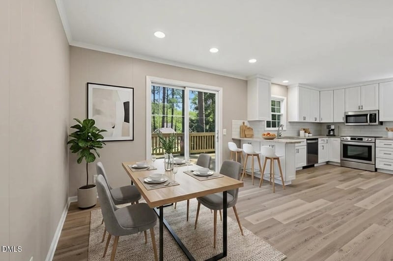 Listing details for 5805 Newhall Rd, Durham, NC 27713 : Classic 1970s ranch with timeless appeal and modern updates throughout! This beautifully refreshed one-story home features new cabinetry, granite countertops, and durable, easy-maintenance flooring designed for today's lifestyle. Updated entry doors, including a new sliding glass unit, open to a spacious new sundeck--perfect for relaxing or entertaining. Enjoy the efficiency of natural gas heat and water heater, along with stylishly renovated bathrooms showcasing new ceramic tile finishes. Nestled on a picturesque wooded lot in the historic Parkwood subdivision, this home offers both privacy and charm. Ideally located with convenient access to Research Triangle Park, RDU Airport, I-40, Chapel Hill, and Durham--making commuting and travel a breeze.