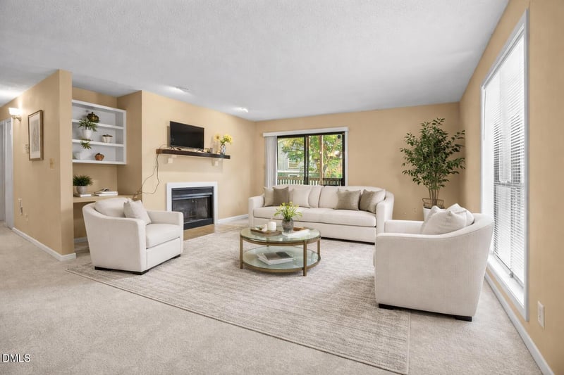 Listing details for 5816 Pointer Dr #102, Raleigh, NC 27609 : Updated 1st-Floor End Unit - Ideal for Homeowners or Investors! 2-bedroom, 2-bath condo offering comfort, convenience, and strong value under $185,000. This desirable fend unit features a functional layout with a cozy fireplace, separate dining area, and a built-in desk with shelving--perfect for working from home or staying organized. Recent upgrades make this home move-in ready, including brand-new 2-ton HVAC (2026), carpet and padding (2025), and updated countertops, appliances, and fixtures (2022) & roof (2019. The primary suite offers a spacious walk-in closet, while the oversized new deck provides the perfect space to relax or entertain. Located in the sought-after Northridge area, you're just minutes from shopping, dining, parks, and everyday conveniences. HOA includes trash service & LOWER than most and investors will appreciate flexible leasing options with a 3-month minimum (see bylaws). Turnkey, updated, and priced to sell--don't miss this opportunity! Showings 8am-10:45am-seller works from home-Virtually staged