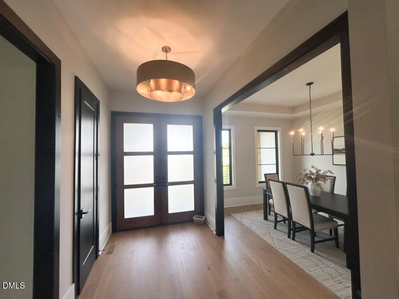 Listing details for 5841 Carriage Gate Dr, Raleigh, NC 27603 : This extraordinary custom built home is situated on a sprawling pool ready lot! The open concept layout features wide plank engineered hardwoods that span the main living areas. Offering a main level owner's suite and a second primary suite upstairs, this residence is perfectly designed for modern living! A 5' aluminum backyard fence, sodding in the entire rear yard and interior buffer trees, allowing for ultimate privacy. The gourmet kitchen features Whisper painted perimeter cabinetry with under cabinet LED lighting and a dramatic Onyx painted island with a Calcatta Patriotic quartz waterfall edge, level three quartz riser backsplash, Ruvati workstation sink and the ZLINE Autograph Series stainless appliances, including a thirty-six inch gas cooktop and wall oven. The space flows into a spacious dining area where a triple slider leads to a Trex BBQ deck, perfect for outdoor entertaining. The family room serves as a stunning focal point, centered by a linear fireplace with a horizontal stacked tile surround and a floating mantle. A 12' multi slider opens to a vaulted screened porch featuring Tennessee Blue Grey flagstone flooring and a custom surround fireplace with designer sconces. The main level Owner's Suite offers a peaceful retreat with a tray ceiling and a large walk in closet with custom shelving. The ensuite bath is a spa style masterpiece, boasting Onyx painted vanities with Calcatta Gold quartz tops and a zero entry walk in shower with a Mystical White matte tile surround. Designed for maximum flexibility, the home includes a first floor guest suite with a custom accent wall and ensuite bath. The second floor continues the luxury with a secondary primary suite featuring its own walk in shower and large walk in closet. Additional recreational spaces include a spacious bonus room, a dedicated media room, and a flex room with custom built ins. With four bedrooms and multiple bathrooms, this energy efficient home also provides ample unfinished walk in storage. This move in ready home combines a private backyard oasis with the high end craftsmanship defining the Raleigh real estate market.