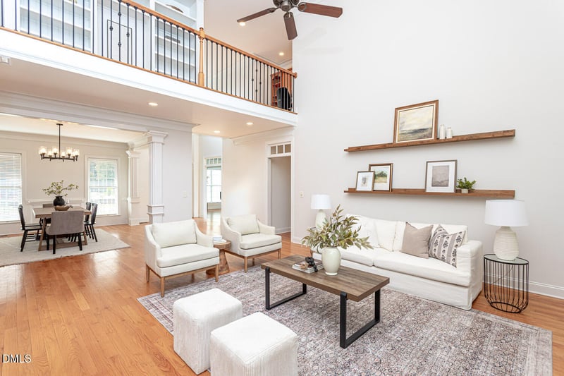 Listing details for 5905 Two Pines Trl, Wake Forest, NC 27587 : Graceful. Elegant. Peaceful. Spring is in full bloom at this Barham Place home! At over 3100sf and almost an acre of manicured land, there is plenty of room to live comfortably inside and out! Oversized windows, custom built-in shelving throughout, transoms, hardwood floors and two story foyer and family room allows for natural light to flood the space. Enjoy a generous first floor primary suite with its own gas fireplace, spa bathroom with walk in shower, soaking tub and large walk in closet. The updated kitchen with granite countertops and SS appliances is the perfect spot for everyone to gather while meals are prepared! Center island workspace, ample cabinetry and integrated breakfast area with a view to the backyard has direct access to the private screened side porch. Enjoy a formal dining room and first floor study/music room in addition to the bright and airy family room complete with a second gas fireplace. Upstairs you'll find an open loft with built in workstation, custom shelving and hardwood floors. Two additional roomy bedrooms, large hall bath with double vanities, huge bonus/flex room AND walk-in attic storage completes the upper level! Old growth trees, raised garden beds and nothing but the sound of birdsong welcome you to the backyard that you can enjoy from a 300sf+ deck. Side entry garage! Walking distance to community pool, gorgeous neighborhood! Roof 2017, HVACs 2016, water heater 2025.