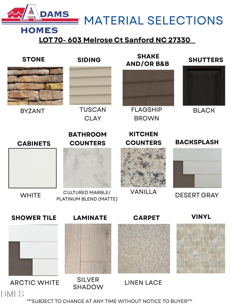 Listing details for 603 Melrose Ct, Sanford, NC 27330 : Discover quality craftsmanship at Southern Estates with this beautifully designed Adams Homes floor plan! This new construction home features 3 generously sized bedrooms, 2.5 bathrooms, and a flexible loft space--ideal for a home office, media room, or additional living area. The open-concept layout is perfect for modern living, showcasing a bright kitchen with crisp white cabinetry, granite countertops, and a timeless gray subway tile backsplash. The adjoining dining space is enhanced with crown molding and wainscoting, creating an elegant setting for everyday meals or entertaining guests. Upstairs, unwind in the spacious primary suite featuring a spa-like bathroom complete with a soaking tub, separate tiled shower, and ample space to relax and recharge. Situated on a desirable corner lot, this home offers added curb appeal, extra outdoor space, and enhanced privacy--ideal for enjoying outdoor living, gardening, or future enhancements. Conveniently located just minutes from Downtown Sanford, with easy access to Fort Liberty (approx. 45 minutes) and RTP (under an hour), this home offers both comfort and accessibility. Schedule your showing today and experience the perfect combination of style, space, and convenience!