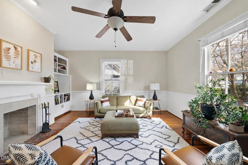 Listing details for 605 Polk St, Raleigh, NC 27604 : Completely timeless. Some homes follow trends. Others quietly outlast them. 605 Polk Street is a rare Oakwood cottage. Set along a charming, tree-lined street, this home showcases craftsmanship and proportions rarely found today. A welcoming covered front porch sets the tone, leading into interiors filled with original hardwood floors, tall ceilings, abundant natural light, and classic millwork. Owner suite offers separate shower, walk in closet, the kitchen addition built in 2008, pairs historic charm with modern convenience, featuring a vaulted ceiling, generous cabinetry, stainless steel appliances, and seamless flow into dining and living areas. Spacious bedrooms include decorative fireplaces, while a bright enclosed porch offers flexible space for a home office, studio, or retreat. Great storage and laundry, Major updates include a new roof (2024), HVAC (2023), and water heater (2021). A huge private backyard and detached storage building offer endless possibilities. Gardening, Crochet, whatever your heart desires.