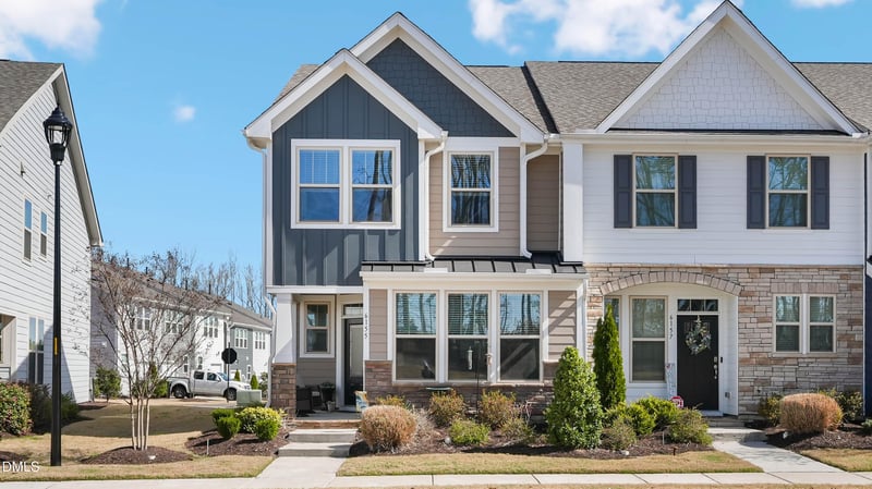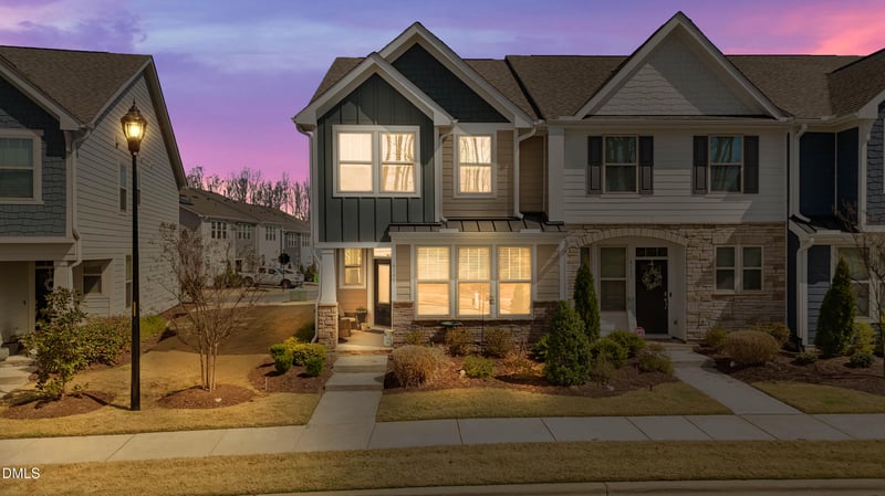 Listing details for 6155 Taylor Rd, Wendell, NC 27591 : Beautifully updated end townhome filled with custom touches and thoughtful details throughout and lots of windows! The main level welcomes you with elegant hall molding, wainscoting and a functional drop zone with hooks. A spacious den featuring large built-in shelves & canned lights throughout. The kitchen is equipped with stainless appliances and Tiled backsplash, upgraded cabinets & granite tops & large bar area. Perfect for casual dining and entertaining. Upstairs, you'll find a well-appointed primary suite showcasing an Electric fireplace on the wall and a Barn door leading to the primary bath that features a bead boarded wall with hooks and a large walk in tiled shower. The space is complemented with a double vanity and a framed mirror and LVP flooring. Two additional bedrooms each feature black fan/light fixtures. Open space in front AND back! This home blends charm and function with unique features that make it move in ready!