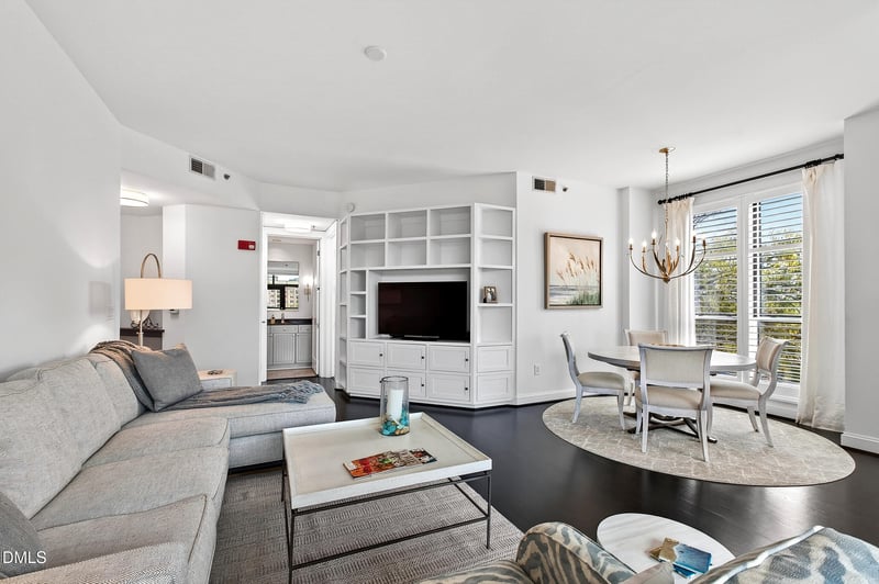Listing details for 618 Boylan Ave #506, Raleigh, NC 27603 : Located in the heart of Raleigh this Stunning Paramount home offers the highest quality and luxury amenities!!! Many Updates!!! Incredible fifth floor views from the corner location with floor to ceiling windows and doors...The open floor plan adds to the spacious feeling. Entry foyer accented by a granite nook. The elegant living room features built-in custom bookcase, drawers and TV cabinet and connects to your private balcony. Open dining room with a custom chandelier and great views! Chef's kitchen with custom cabinets and hardware, quartz countertops and stainless appliances...great views. Owners suite accented by custom wallpaper, stunning chandelier, newly installed custom carpet, dual vanity sinks, large glass shower and a walk-in closet with custom shelves. Secondary bath with wallpaper and a glass tub surround. Perfect hardwoods accent the white walls and trim for a designer look!!! The Paramount offers a gorgeous pool and large tanning patio and gas grilling area. The Homeowners lounge features a full kitchen, tables and chairs to eat or gather to enjoy. There is a library and pool table also.! A large Fitness Center offers on-site exercise facilities. The pool, homeowners lounge and fitness amenities are all conveniently on the 5th floor.Located on the 10th floor is an owner's Terrace. One floor down to your 2 car assigned parking garage (4th floor #151& 152).