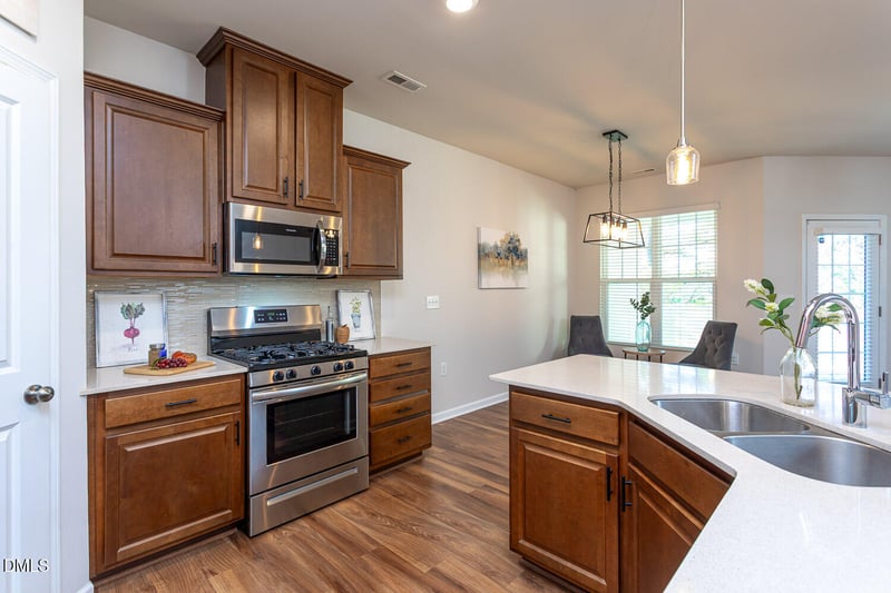 Listing details for 6197 Beale Loop, Raleigh, NC 27616 : Lovingly maintained NE Raleigh TOWNHOME is ready for new owners! Elegant trimwork gives a custom feel and makes this home extra special! Built in 2019, this 1700+sf home offers 3 spacious bedrooms, a separate laundry room and high ceilings upstairs. The master bedroom is luxurious with a large walk-in closet and stunning bathroom with double vanities and a walk in shower. The gorgeous kitchen is thoughtfully designed to allow for great workflow with a curved quartz island, SS appliances including a gas stove with fully vented exhaust and roomy corner pantry! A light and bright dining area and gas fireplace in the living area keeps the open floor plan feeling cozy. Covered rear patio and front porch offers plenty of space to enjoy a little fresh air. A deep, one car garage provides more storage. This sweet home is in an amenity-rich neighborhood and conveniently located to easily get anywhere you need to go!