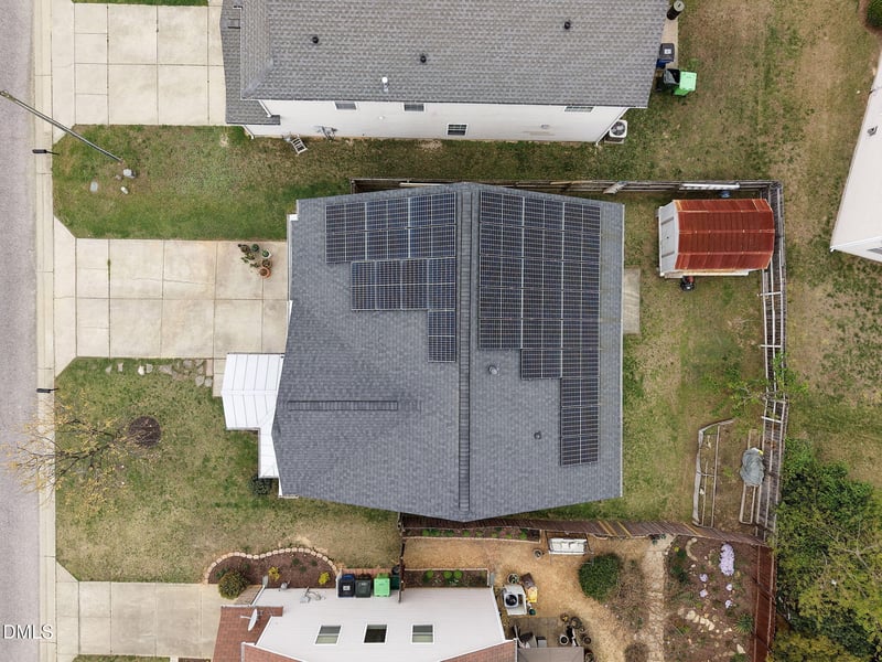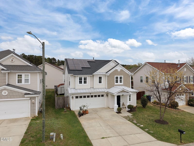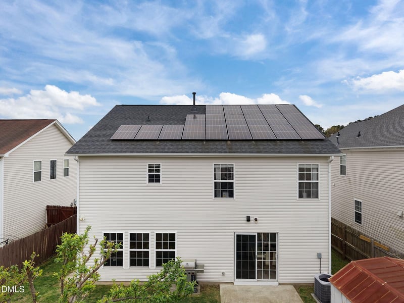 Listing details for 6307 Quitman Trl, Raleigh, NC 27610 : This appealing and energy-efficient two-story home comes equipped with solar panels, offering the new owners the advantage of reduced utility bills, with the seller covering their cost at closing. Upon entering, you'll notice an open floor plan with LVP flooring throughout both levels and a spacious family room featuring a cozy gas log fireplace. The kitchen is fitted with stainless steel appliances, a modern backsplash, Silestone Quartz countertops, and a striking 11-foot island. All bedrooms and the laundry room are conveniently situated upstairs. The master suite, sized at 16 by 16 feet with tray ceilings, includes a luxurious bathroom with an oval soaking tub and a separate shower. Outside, you can enjoy a backyard enclosed by a six-foot privacy fence and a sizable storage shed. The roof was updated three years ago with architectural shingles, and the water heater was replaced in 2020. This home is truly a must-see.