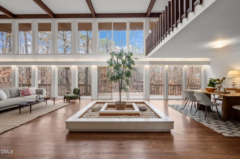 Listing details for 634 Kensington Dr, Chapel Hill, NC 27514 : Experience iconic mid-century design in this striking Jon André Condoret-designed residence in Coker Hills West. Built in 1975 and offering nearly 4,760 SQ FT, this 5-bedroom, 4-bath home showcases the clean lines, natural materials, and purposeful geometry that define true modernist architecture. A dramatic two-story wall of windows anchors the main living area, opening the interior to expansive wooded views and filling the home with natural light. Thoughtfully designed for both privacy and connection, the layout includes multiple living spaces, an office, a flexible bedroom configuration (including a first floor bedroom), and seamless flow to the outdoors. A large elevated deck overlooking nature provides the perfect setting for morning coffee, evening gatherings, or peaceful reflection. The wooded lot offers rare privacy just minutes from everyday conveniences, including a short walk to Estes Hills Elementary. The home retains all the original key architectural details, and the original build specifications will transfer to the next steward—ideal for buyers who value authenticity and design integrity. A timeless modern retreat in one of Chapel Hill's most beloved neighborhoods.