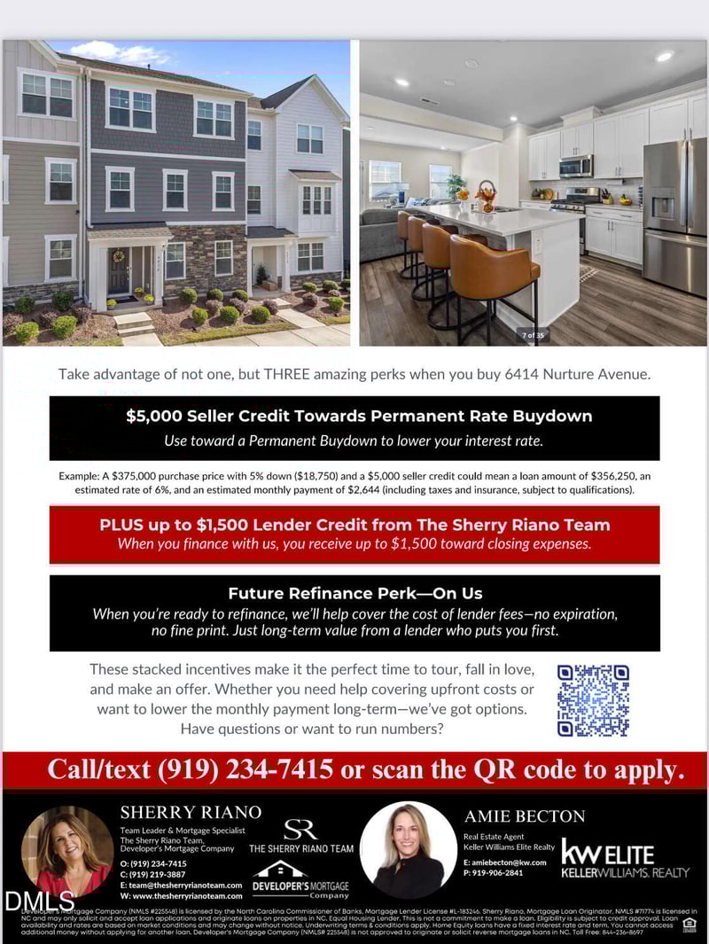 Listing details for 6414 Nurture Ave, Raleigh, NC 27616 : Take advantage of reduced up front fees & long term savings with stacked incentives! Here's your chance to own a 4-bedroom, 3 bath, 2-car garage townhome with space, flexibility, and low-maintenance living! Incentives include $5,000 seller credit + $1,500 lender credit + future refinance fees waived when using the preferred lender. PLUS all appliances convey. Truly move in ready!