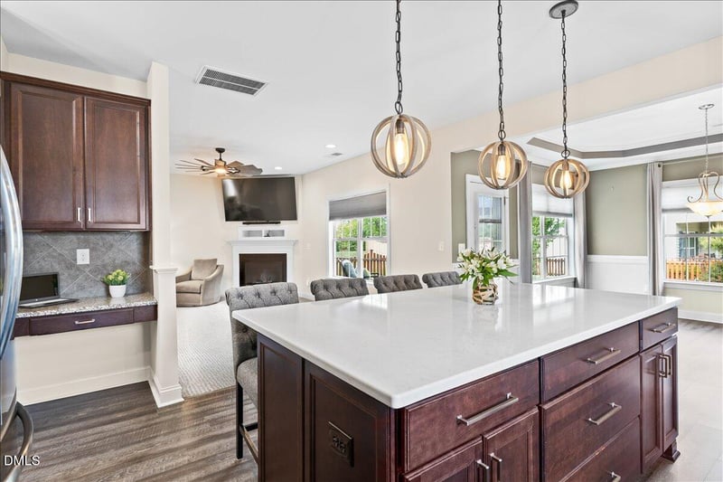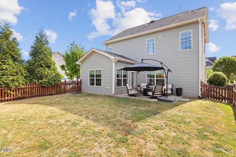 Listing details for 650 Monterey Pine Dr, Fuquay Varina, NC 27526 : Welcome Home to This Stunning 4-Bedroom Corner Lot Gem in Fuquay-Varina! Step into this beautifully maintained home featuring a welcoming entry foyer that opens into a bright, spacious open-concept first floor plan. Perfect for entertaining and everyday living, the main level flows seamlessly from the living areas into the gourmet kitchen and dining space. The kitchen is a true standout with a quartz countertop on the large center island, soft-close cabinet doors, a tiled backsplash, and stainless steel appliances! Including a gas stove! There is also an outlet for electric stove if you prefer. LVP flooring throughout the kitchen, foyer and dining room adds durability and style, while the tray ceiling in the dining room creates an elegant touch. Gorgeous Upgraded lighting fixtures! A gas fireplace anchors the living area, ideal for cozy evenings. Livingroom overlooks the beautiful backyard. Convenience abounds with a half bath on the first floor, blinds throughout the home, and screens for all openable windows. Upstairs, the primary suite is a luxurious retreat with walk in closet, ceiling fan, dual sinks, a walk-in shower, and a soaking tub. Three additional bedrooms provide ample space for you, your guests, or a home office. The home also features a 3rd floor 33 x 14 walk-up unfinished attic pre-plumbed for a bathroom, Tech Shield insulation, a two-year-old roof, and an HVAC system with in-line filter for year-round comfort and efficiency. The side-load garage boasts epoxied flooring, fully painted with finished drywalls on all sides, and a storage closet making it as functional as it is impressive. Outside, enjoy North Carolina living at its best: a covered front porch welcomes you home, while the large patio is perfect for gatherings. The picket fence encloses the backyard, and extensive, gorgeous landscaping enhances the curb appeal on this premium corner lot. A storm door at the main entry and patio entry adds extra protection and charm. Prime Location Alert! This home is in a sidewalk community and is within easy walking distance to downtown Fuquay-Varina, Fleming Fields Town Park and the town's Community Center, complete with baseball diamonds, splash pad, gym, basketball courts, and a walking trail offering unbeatable convenience for the new homeowners and outdoor enthusiasts. This move-in-ready 4-bedroom beauty checks every box with thoughtful upgrades and timeless appeal. Don't miss your chance to call it home!