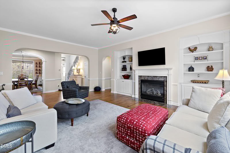 Listing details for 701 Royal Tower Way, Cary, NC 27513 : Every detail of this exceptional home reflects thoughtful design and timeless elegance. From the moment you step inside, you're greeted by soaring 10' ceilings, extensive crown molding and beautiful hardwood floors that flow throughout the main level. The gracious floorplan offers both formal and casual living spaces, including a refined dining room with classic wainscoting, a formal living room and a warm, inviting family room featuring a fireplace and charming bay window. The well-appointed kitchen is a chef's delight, complete with a center island, breakfast room, pantry and a full suite of stainless steel appliances, including a gas range, wall oven and refrigerator. Just off the kitchen, a cozy keeping room - currently used as an office - adds versatility along with an additional tucked-away workspace off the hallway. The main level primary suite is a true retreat with a tray ceiling and a spa-inspired bath with luxurious finishes. Upstairs, a rare and desirable back staircase leads to a spacious bonus room, currently used as a home gym. This level also features a guest suite with a private bath, a media room with wet bar and closet (ideal as a fifth bedroom) and additional generously sized bedrooms. Function meets convenience with a main-floor laundry room complete with cabinetry and a utility sink. A two-car garage and three walk-in attic spaces providing abundant storage. Step outside to your own private oasis. The fully fenced backyard backs to a protected 20-acre green space offering unmatched privacy and natural beauty. Enjoy outdoor living on the expansive deck, gather around the stone patio and firepit or cultivate your own garden retreat. An added feature is the whole-house surround sound so you can enjoy your favorite music inside and outdoors. Roof replaced 2021. Perfectly situated on a quiet cul-de-sac, this home also offers direct access to the Cary Greenway just at the end of the street. HOA dues include access to pool and playground. Highly regarded schools. A rare find in every sense, this property is a magnificent place to call home.