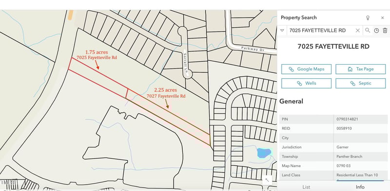 Listing details for 7025 Fayetteville Rd, Raleigh, NC 27603 : Exceptional location for townhomes or single-family development. Prime residential opportunity in Raleigh! Adjacent lots (7025 and 7027 Fayetteville Rd), totaling 4 acres, zoned residential and ready for development. Ideally located near numerous local amenities, including shopping, dining, and schools. By-right suitable for townhome and single-family development; buyer to confirm with City of Raleigh. Don't miss this rare opportunity to secure a double lot in a thriving area!