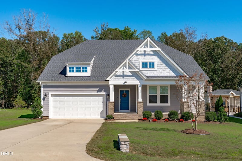 Listing details for 7033 Leando Dr, Willow Springs, NC 27592 : This beautiful 4-bedroom, 3-bath Craftsman-style home located in the desirable Bloomfield pool community offers the perfect blend of comfort, style, and functionality. Situated on a large, level lot with serene wooded views, this home features a spacious open floor plan and a 2-car garage for added convenience. The heart of the home is the stunning kitchen and family room. The gourmet kitchen boasts a herringbone tile backsplash, stainless steel appliances including double ovens, gas range and pendant lighting over a large island ideal for entertaining. The adjacent family room features a cozy gas fireplace, a modern ceiling fan, and engineered hardwood floors that continue into the kitchen and primary suite. Three generously sized bedrooms are located on the main level, including a spacious primary suite with a luxurious ensuite bath featuring a frameless glass rain shower with bench seat, dual vanity, and a stylish vessel soaking tub, a perfect retreat after a long day. A fourth bedroom, flexible space, and a bonus area with freestanding bookshelves are located upstairs, ideal for a home office, guest suite, or media room.