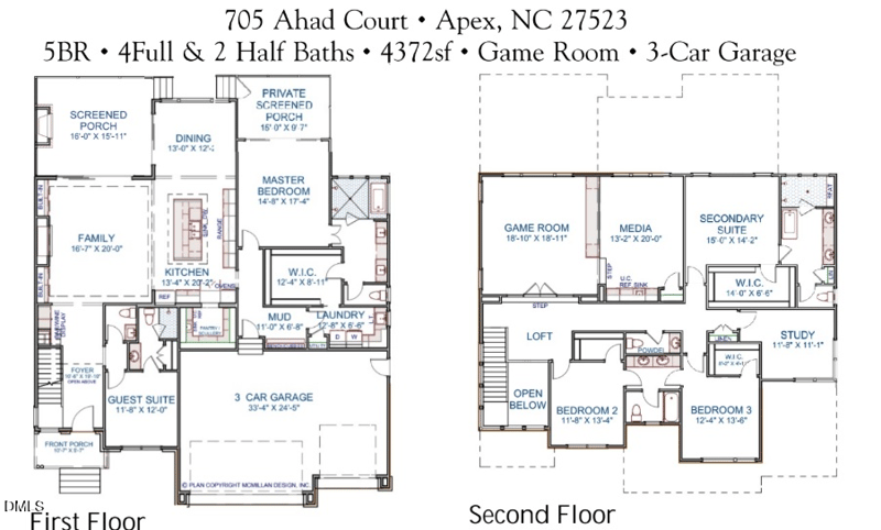 Listing details for 705 Ahad Ct, Apex, NC 27523 : May/June Completion!! Welcome to Estates at White Oak!! Have You Ever Seen a 100% Modern Contemporary Neighborhood!! Rare Double Primary & Double Screen Porch Plan! A Modern Exterior & Lifestyle Community! The Wooded Views from the Rear Windows is Both Beautiful, Calming, & Permanent Open Space! This Home's Elevation is Eye Catching w/Modern Rich Color & Brick Accented Neptune Plan w/Inviting Foyer w/Impressive Window Accented 2 Story Staircase w/1st Floor Featuring a Large Trayed Primary Bdrm w/Tub Inside the Shower & Private Screen Porch w/Upgraded Decking Floor! Guest Suite/Study w/Private Full Bath! Nice Inviting Dining Rm with View!, Large Inviting 20x16.5 Family Rm w/11' Trayed Ceiling & 12' Wide Glass Siders to Screen Porch w/FP w/Upgraded Decking Floor!! Gourmet Kitchen w/Large Hidden Pantry & Stainless Steel Appliances! Laundry, Mudroom, & Primary WIC All Connected! The 2nd Floor Features 2nd Primary Bdrm & 2 Bdrms w/Full Bath Access & WICs! Private Study! Huge Bonus Rm w/Awesome Media Rm!! Large 3 Car Garage!! 10' Ceiling on 1st w/9' Ceilings on 2nd Standard! North Facing!! Price Includes Great Structural Options & Upgraded Interior Finishes!! Great Location!! Great Wake County Schools!! Contact Listing Agent for further details or with any questions!! Other Homesites Available!! The Models on Lots 2 & 17 are framed and Walkable!! You are Welcome to Visit the Community and See Your Future Homesite and that Back Yard View!