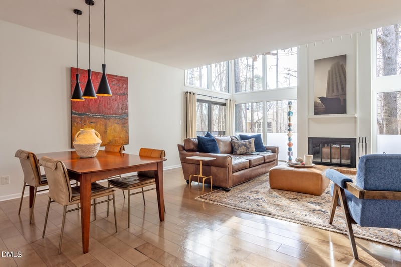 Listing details for 708 Constitution Dr #F, Durham, NC 27705 : Fall in love with this playful, light-filled contemporary tucked into the trees of Pebble Creek: a home that just might be struck by cupid's arrow. Condo convenience paired with townhome-style scale and functionality offers the best of low-maintenance living without sacrificing space or comfort. Surrounded by the natural beauty of Duke Forest and bathed in sunshine from dramatic floor-to-ceiling windows, this home blends architectural interest with fresh, eclectic updates throughout. Inside, vaulted ceilings and an open living space create an airy, modern feel, while engineered hardwoods run through the main areas. The front flex room can easily serve as an office, studio, study, or game room. The kitchen brings both personality and function, featuring a freestanding ILVE gas range in a sophisticated blue finish, updated lighting, and easy flow for everyday living or entertaining - sure to be a sweet spot for gathering with the ones you love. A kitchenette in the laundry area adds flexibility with a range, sink, and mini fridge and is ideal for guests, hobbies, or multi-purpose living. Updated lighting and design-forward touches add to the home's overall sense of style and personality. Upstairs, the spacious primary loft serves as a private retreat, set apart from the additional bedrooms on the opposite wing of the home. Generous closet space and a spa-like bath with a zero-entry shower and handheld fixture create a relaxing, tucked-away feel. Major updates include a roof replacement in 2023 - one more reason this home is easy to love. Enjoy Pebble Creek's renovated clubhouse and newly refreshed pool, along with a dog park, tennis court, and direct access to Duke Forest trails right outside your door. The setting offers a rare blend of tight-knit community living and everyday immersion in nature, paired with unbeatable proximity to Duke and downtown Durham. A contemporary retreat that feels both vibrant and peaceful - so charming it might just have you saying ''be mine.''