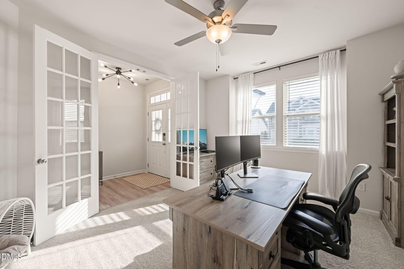 Listing details for 710 Tibumoll Ln, Fuquay Varina, NC 27526 : This one checks every box and then some! This home offers a layout that actually works for real life with elevated finishes throughout. A covered front porch sets the tone, leading into a bright interior with beautiful LVP flooring and modern lighting. Office with glass French doors for work-from-home setup. The kitchen stands out with quartz countertops, porcelain farmhouse sink, tile backsplash, ss appliances, wall oven, and a cooktop with hood. Huge eat-in island. Oversized walk-in pantry with wood shelving is ready for all your Costco runs! The kitchen flows into the living room, complete with custom built-in cabinets and shelves, and a gas fireplace. Open dining area that makes entertaining easy. You will never complain about needing more storage - coat closets, a large flex storage closet, and additional space under the stairs for everyday essentials. A mudroom keeps things organized. Upstairs, the primary suite is spacious, featuring a beautifully designed bathroom with a tiled walk-in shower, dual vanities, and not one, not two, but THREE walk-in closets! Three additional bedrooms and a full bathroom with dual sinks and tub/shower, plus a bonus room! The laundry room with sink and cabinets. Out back, enjoy the patio overlooking a flat, fully fenced yard with a wood privacy fence. The tandem garage provides incredible flexibility for a 3rd car, home gym, workshop, additional storage, or perhaps the golf simulator you've been dreaming about! Located in Bent Tree, enjoy access to the community pool and playground! Minutes to Fleming Loop Recreational Park, downtown Fuquay-Varina and easy access to Judd Parkway, US-401, Hwy 55, and the Triangle Expressway!