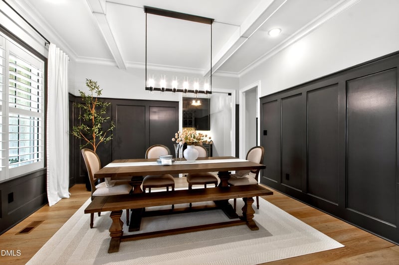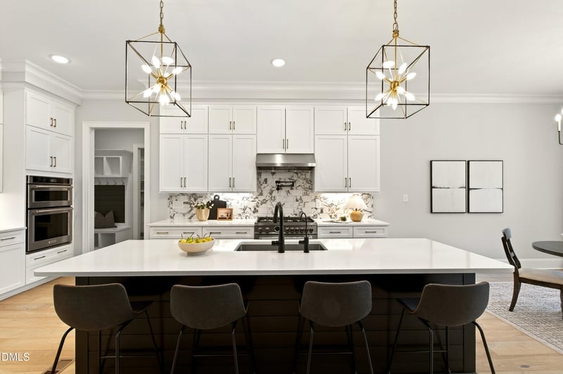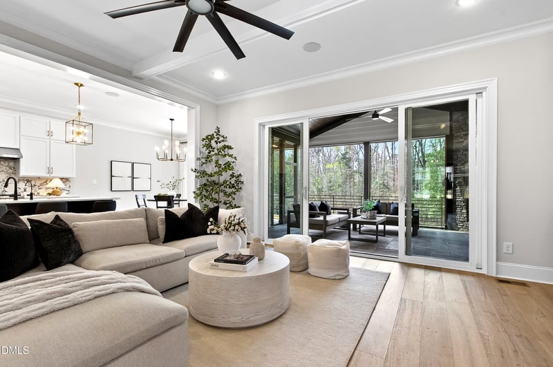 Listing details for 7113 Barn Owl Ln, Raleigh, NC 27614 : Located in the sought after Falls Reserve community, 7113 Barn Owl Lane offers a rare combination of luxury, privacy, and thoughtful design, ideally situated at the end of a cul de sac and backing to Army Corps of Engineers land near Falls Lake. With a striking brick and composite siding exterior, gas lanterns, landscape uplighting, and a rare side-entry 4-car garage, the curb appeal makes an immediate impression. Upon entering the home, you're greeted by 10-foot ceilings and site-finished wide plank white oak floors that run throughout the main living areas of the first and second floors. The foyer welcomes you with board and batten detailing, while the dining room features accent beams and connects to a beautifully appointed wine and beverage room with glass doors, tile flooring, two mini refrigerators, and ceiling uplighting. Designed for both everyday living and effortless entertaining, the main level includes a first-floor office, an expansive family room with accent beams, custom tile-framed floor-to-ceiling gas fireplace, built-ins, and expansive sliding doors opening to the screened porch. The kitchen is equally functional and refined with ceiling-height white cabinetry, quartz countertops, tile backsplash, a large center island with designer pendant lighting, stainless steel appliances, and an upgraded Bertazzoni gas range and oven. You'll also find built-in speakers, and a breakfast nook with direct porch access. A standout feature is the oversized scullery, complete with a full-size refrigerator, dishwasher, sink, extensive cabinetry, and open shelving for additional prep and storage space. Also on the main floor is the private primary suite with a shiplap tray ceiling and a luxurious bath featuring floor-to-ceiling tile, an oversized glass shower, freestanding tub, dual vanity, water closet, linen storage, and a custom walk-in closet. On the opposite side of the first floor, you'll find a secondary guest suite with a full bath and walk-in closet. This floor plan allows both guests and owners the utmost privacy. Upstairs, you'll find three additional bedrooms, each with en-suite baths, along with two bonus spaces. One bonus space features a dry bar, built-in cabinetry, quartz countertops, and a mini refrigerator, while the is spacious enough to host a pool table and has an additional flex space for a card room, speakeasy, or the like. These spaces offer incredible flexibility for recreation, media, or lounge space. Outdoor living is just as impressive, with a vaulted screened porch featuring a stone gas fireplace and built-in ceiling speakers, all overlooking the beautifully designed Desjoyaux saltwater pool with tanning ledge, heating capability, Techo-Bloc decking, and a sleek metal pergola with roll-down shades. A separate hot tub spa is also featured for another area to enjoy relaxation. A gravel fire pit area adds yet another gathering space, while thoughtful upgrades like a Kinetico advanced water filtration system, fully insulated and temperature-controlled crawl space, whole-house humidifier, and unfinished storage room round out this exceptional home.
