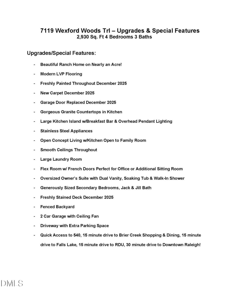 Listing details for 7119 Wexford Woods Trl, Raleigh, NC 27613 : Discover the ease of true one-floor living in this beautifully updated ranch home, perfectly situated in desirable North Raleigh. Recently painted with new carpet in 2026, this move-in-ready gem blends modern style with everyday comfort. Step inside to a bright, open layout featuring durable LVP flooring throughout the main living areas. The open-concept kitchen and family room create an inviting space for both daily living and entertaining. The kitchen boasts granite countertops, a large island with breakfast bar, ample cabinet space, and stainless steel appliances - everything today's buyers are looking for. Relax in the spacious owner's suite, complete with a spa-inspired bathroom featuring a dual vanity, soaking tub, walk-in shower, and his-and-hers walk-in closets. Two additional bedrooms enjoy a convenient Jack-and-Jill bath, ideal for family or guests. Step outside onto the back deck and unwind while overlooking the private, partially wooded backyard - perfect for morning coffee, evening relaxation, or weekend gatherings. Located just minutes from 540, this home offers unbeatable convenience: only 15 minutes to Brier Creek for premier shopping and dining, 15 minutes to Falls Lake for boating, trails, and outdoor adventure, and 15 minutes to RDU. Also just a 30 minute drive to everything Downtown Raleigh has to offer! Homes like this don't come along often - schedule your private showing today and make this North Raleigh retreat your own! * Home was under contract until buyer's changed their minds. Summary of inspection report available upon request. *